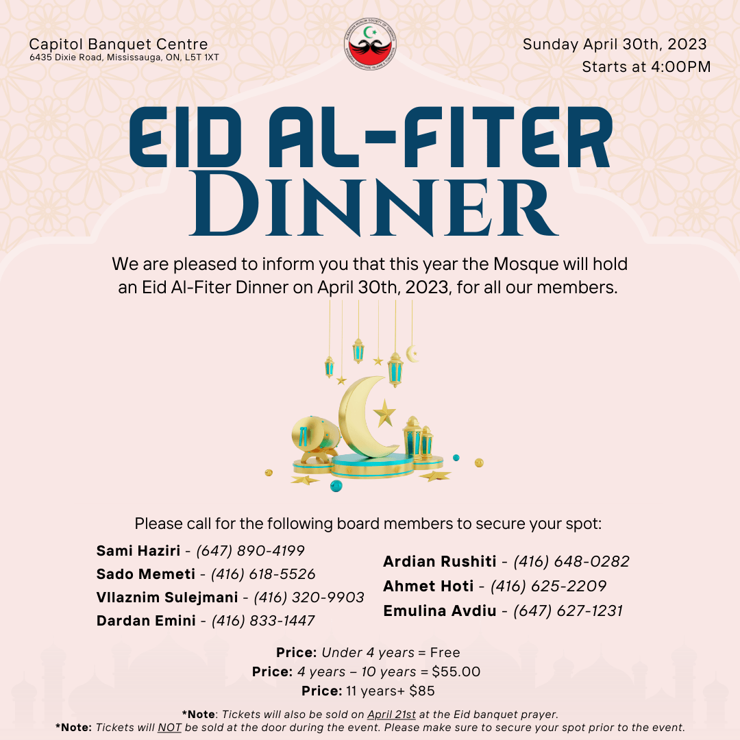 We are pleased to inform you that this year the Mosque will hold an Eid Al-Fiter Dinner on April 30th, 2023 for all our members.