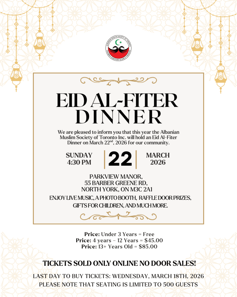 The Albanian Muslim Society of Toronto Inc. invites you and your family to attend our Eid Al-Fitr Dinner on Sunday, March 22, 2026 at 4:30 PM. This annual event brings our community together to celebrate Eid in a setting that reflects unity, gratitude, and shared tradition.