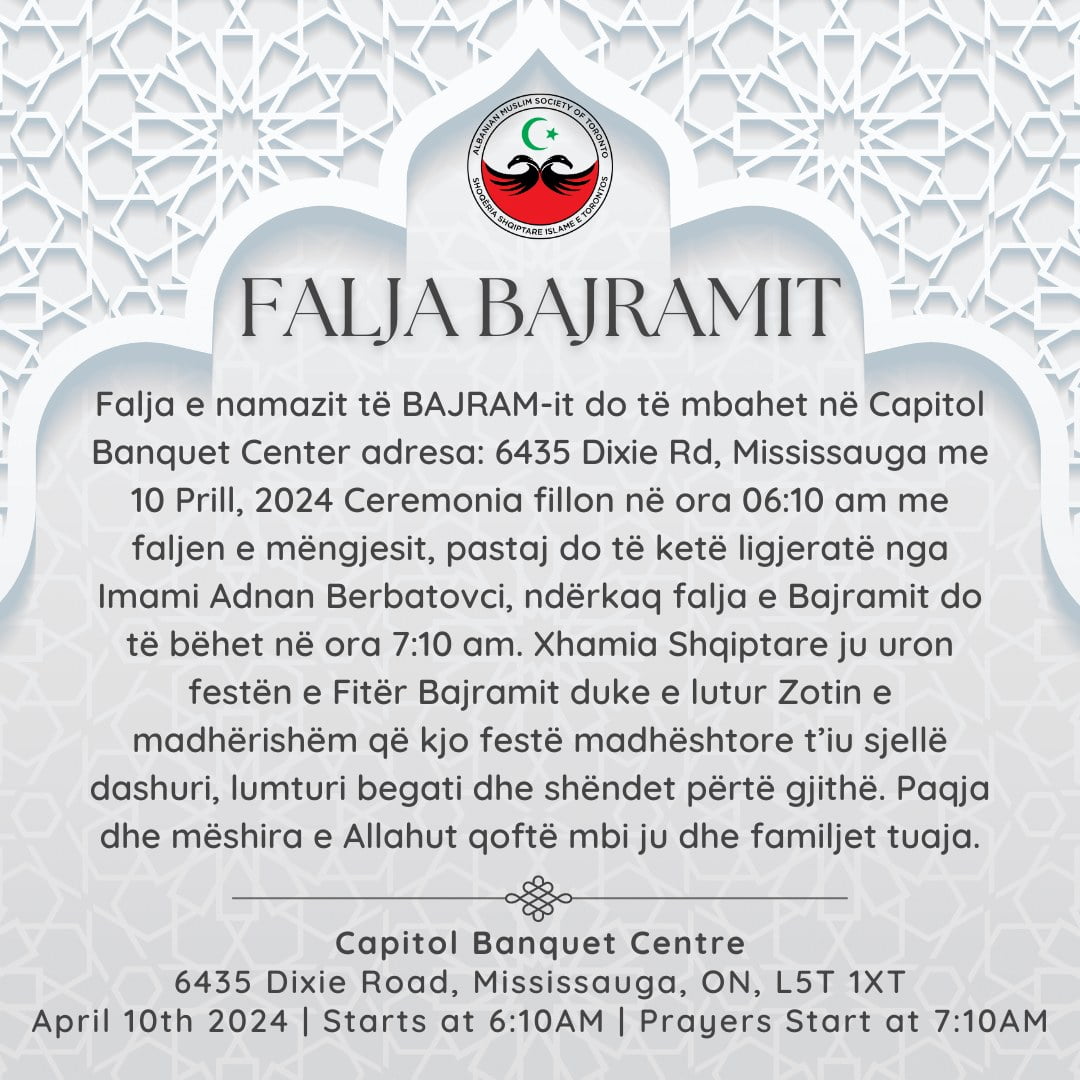 Kemi nderin të ju informojmë se falja e namazit të Bajramit do të bëhet në Qendrën e Banketit Capitol më 10 Prill 2024 në orën 6:10.