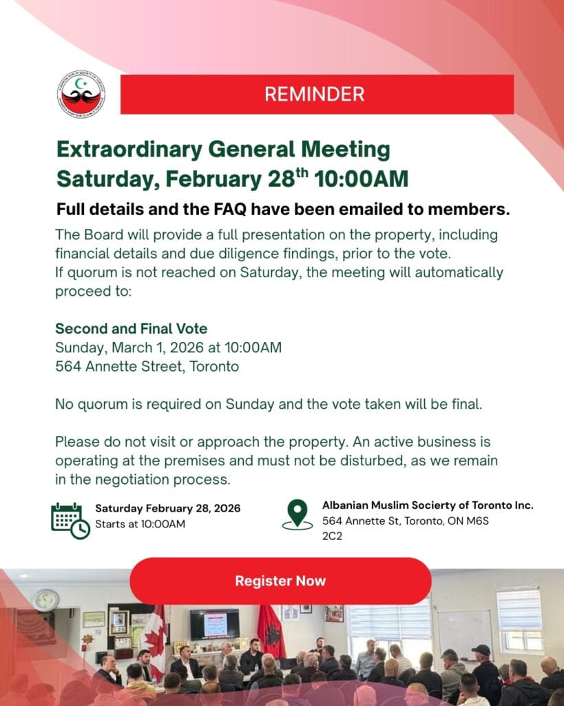 The Albanian Muslim Society of Toronto INC. will hold an Extraordinary General Meeting to vote on the proposed purchase of 124 and 126 Queens Plate Drive, Etobicoke. Meeting Details: Saturday, February 28, 2026 at 10:00AM564 Annette Street, Toronto A full Board...
